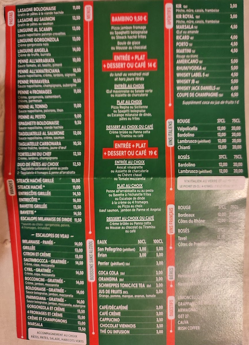 Vegetarian pizza, pitcher of rose, Cyril ice cream for 23.50 All excellent Couscous on Thursday Welcoming boss, pleasant room. Access to the toilets a little complicated for an elderly person (stairs) I recommend