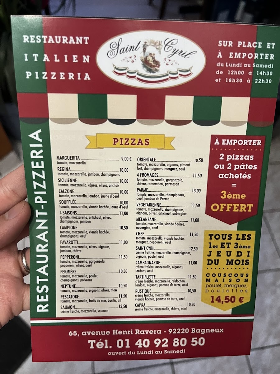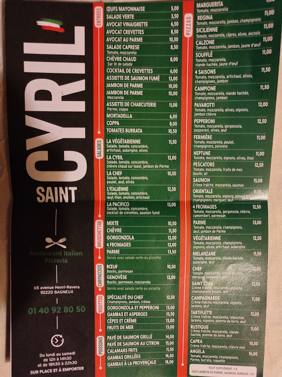 Saint Cyril is a hidden gem located in Bagneux, EMEA, offering a delectable array of Mediterranean-inspired dishes that are sure to tantalize your taste buds. From their mouthwatering Salades like the Salade cyril with chèvre chaud on toast and ham de Parme, to their savory Escalopes des veaux like the Escalope Cyril gratinée au four, every bite at Saint Cyril is a culinary delight.